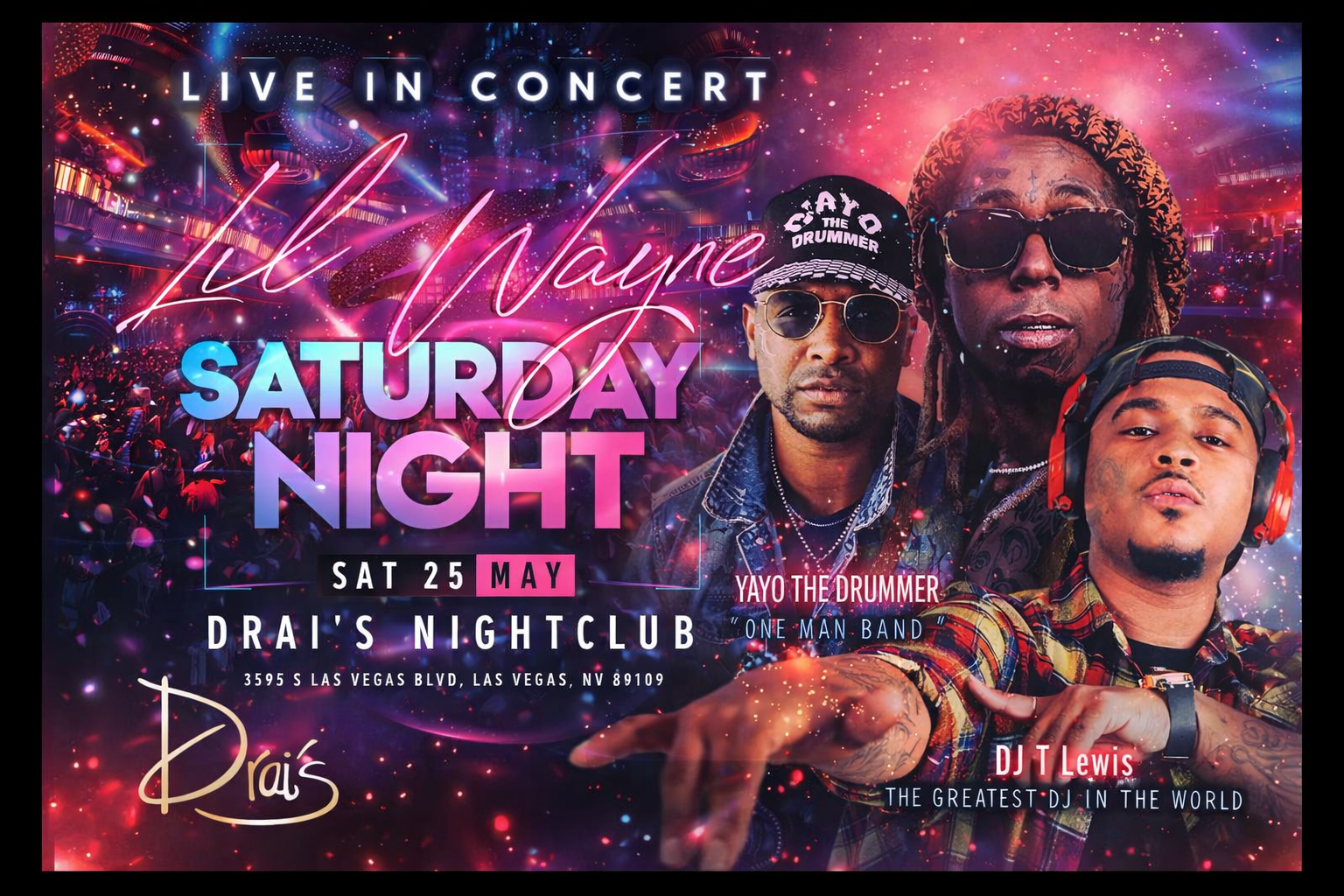 We partnered on creative and promotional support for Lil Wayne and Young Money during a live performance at Draiβs Nightclub, one of Las Vegasβ most iconic nightlife venues.